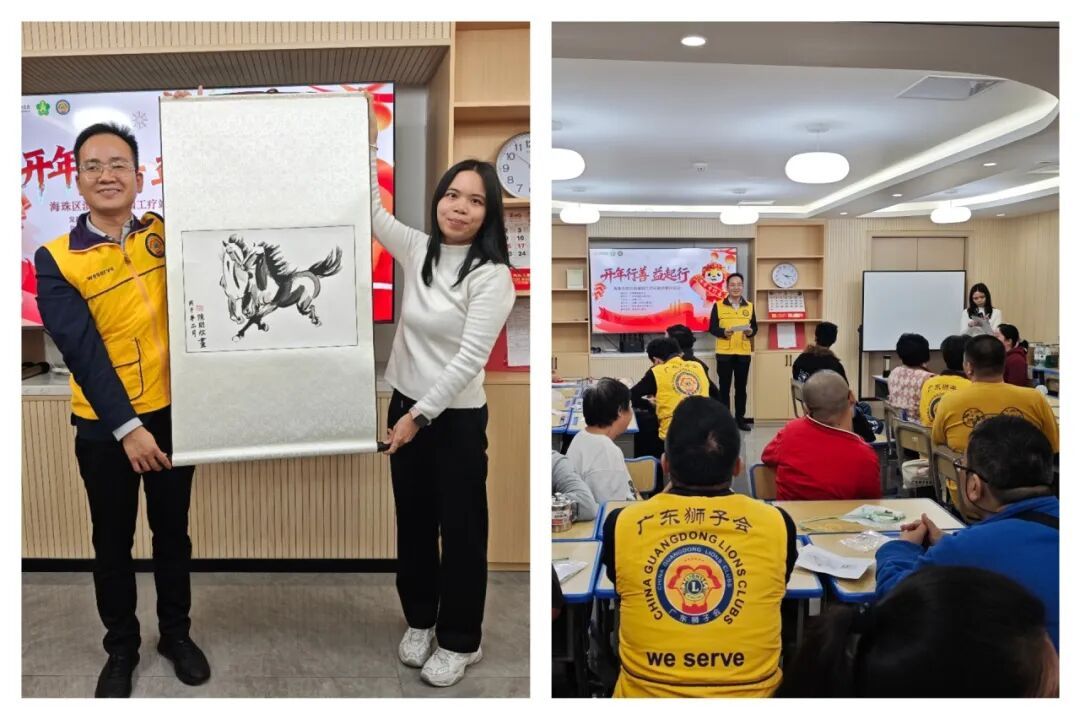 活动现场,海珠区滨江街康园工疗站叶站长向广东狮子会快乐服务队颁发感谢状,并赠予一幅由工疗站工作人员亲手绘制的“双马图”。这幅寓意深远的画作,不仅寄托了工疗站对双方新一年继续并肩同行的美好期望,更是对快乐服务队长期深耕扶残公益事业的高度认可,象征着一份沉甸甸的信任与责任。